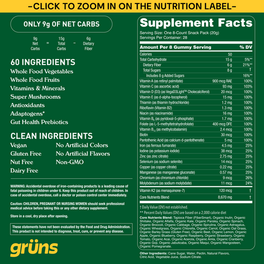 Gruns Adults Super Greens Gummies, Multivitamin Superfood Gummy Bears with Spirulina, Chlorella, Prebiotics & Fiber for Digestive Health, Adaptogens Supplement with 20 Vitamins & Minerals, 28 Count