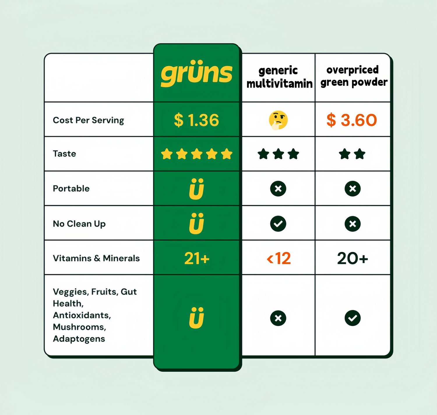 Comprehensive: Nutrition that works. Grüns replaces handfuls of health productat a fraction of the cost.
