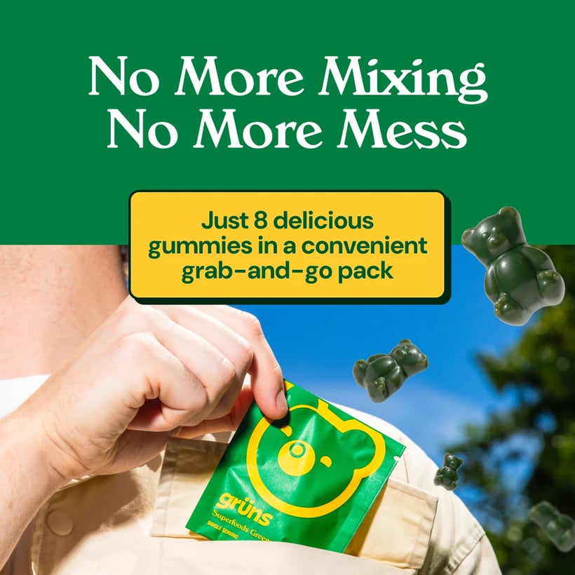 Grüns is thoughtfully formulated to be a delicious and seamless addition to your daily routine with our convenient individual snack packs. Each pack contains tasty gummy bears so there’s no more cobbling together handfuls of supplements. Enjoy the delightful flavor and benefits of our comprehensive nutrition gummies anytime, anywhere. 28 daily packets for an easy use, on-the-go, and mess-free comprehensive nutritional snack. Enjoy one easy pack per day!
